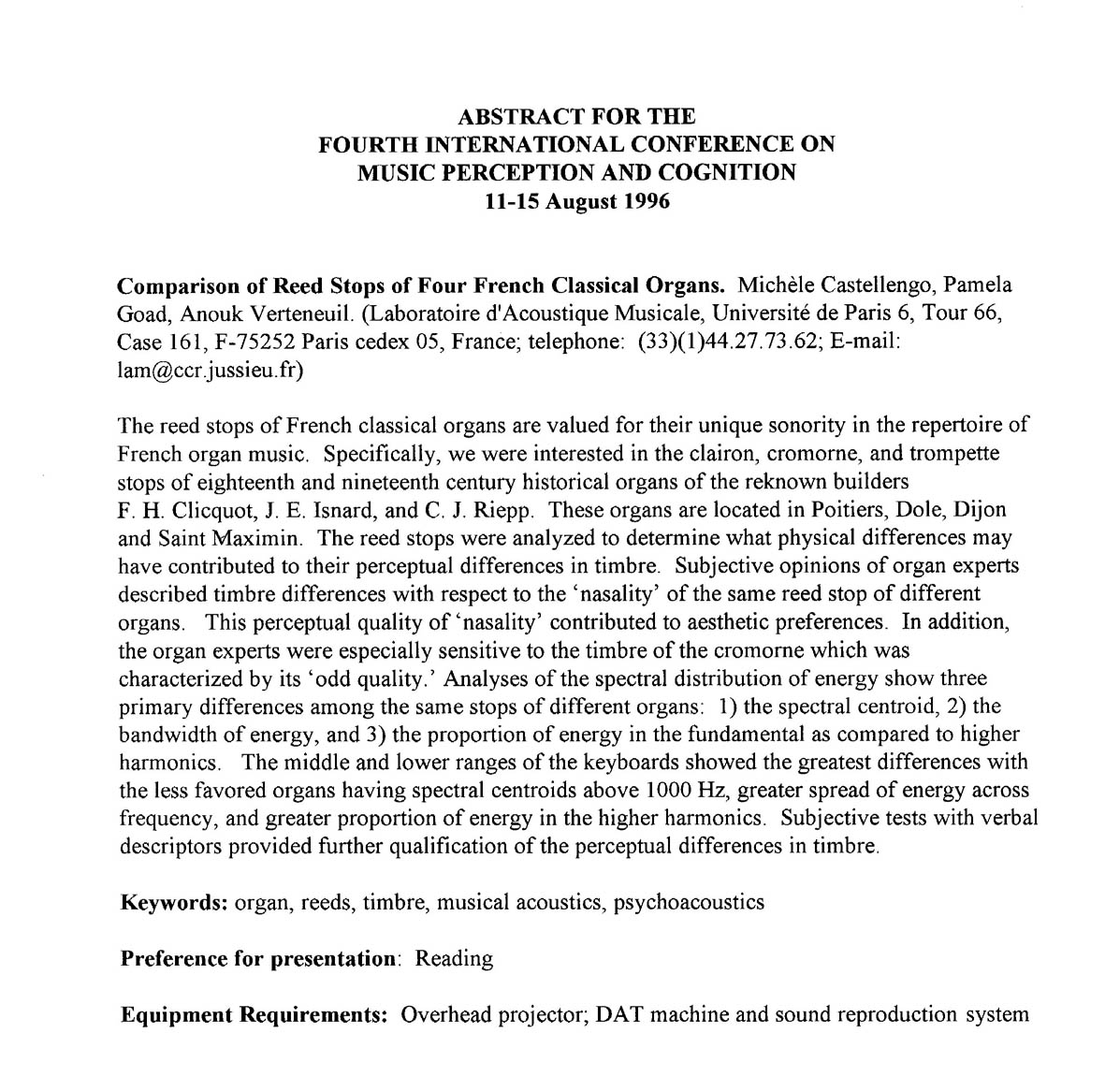 1999 e — Castellengo, M., Besnainou, Ch., Dubois, D. - Acoustical quality of musical instruments and categorization, Joint Meeting: ASA and Forum Acusticum, Berlin. Conférence invitée.