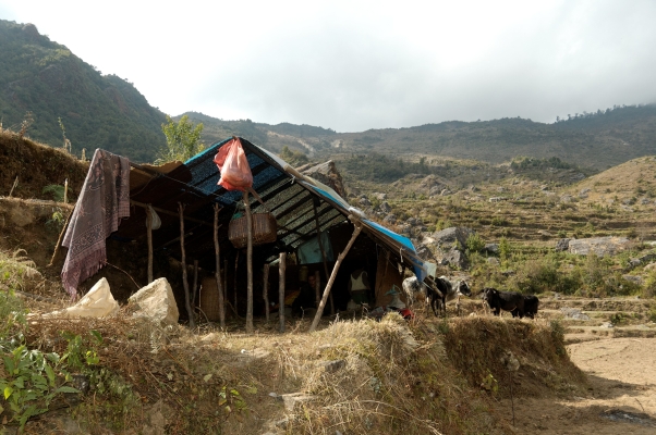 At about lunch time, Hari and me were feeling a bit hungry and of course there are no shops and no restaurants further in the hills, from my village. There is no high school either (which means that children would have to walk at least half a day for the closest of them to go to school, which is of course impossible!). So Hari asked a few villagers but most of them did not have enough food to feed us! We finally find a family living in a more than rustic shelter as you can see on the picture.