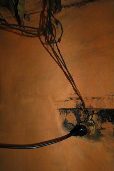 There is tap water in the form of a fountain (picture above) which is shared by three houses, and there is electricity (well, when it works!!!), mainly used for sparse lighting (one light in the front of the house, one in the kitchen and 2 upstairs). But there are a few plugs which are never used by the family but which are useful for Hari to charge his mobile when he comes and for me to charge my laptop (although I never stop wondering when it’s going to explode regarding the archaism of the electric installation as you can see yourself in the picture below!)