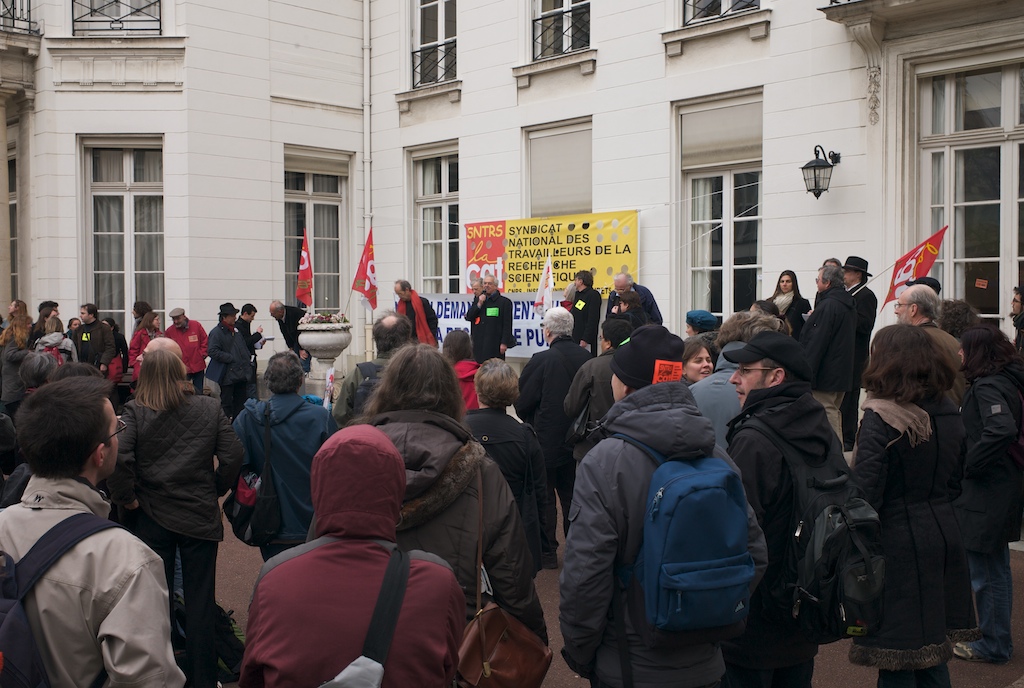 Quelques centaines de chercheurs, enseignants-chercheurs, ingénieurs et techniciens, doctorants, précaires se sont réunis au siège du CNRS ce matin pour empêcher la tenue du Conseil d’Administration du CNRS prévue à 9h. Le blocage de ce CA, comme de tous les Conseils d’Administration des organismes publics de recherche, s’inscrit dans la logique des actions actuellement menées dans les universités et les laboratoires : mettre un terme à une politique catastrophique pour l’avenir de notre système de recherche et d’enseignement supérieur. Plus d'informations sur ce CA sont disponibles dans le document rédigé par les élus du personnel.
