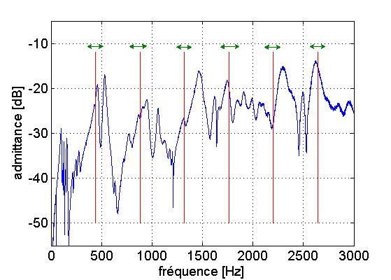 Vert: déviation des harmoniques due au vibrato