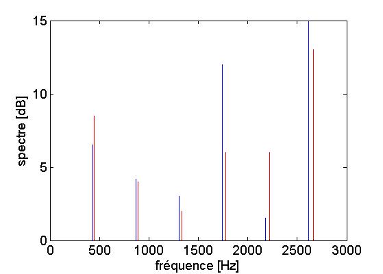 Spectre d'un La 440Hz joué sur le violon V avec un vibrato d'amplitude 2%: en bleu au minimun de fréquence, en rouge au maximum.