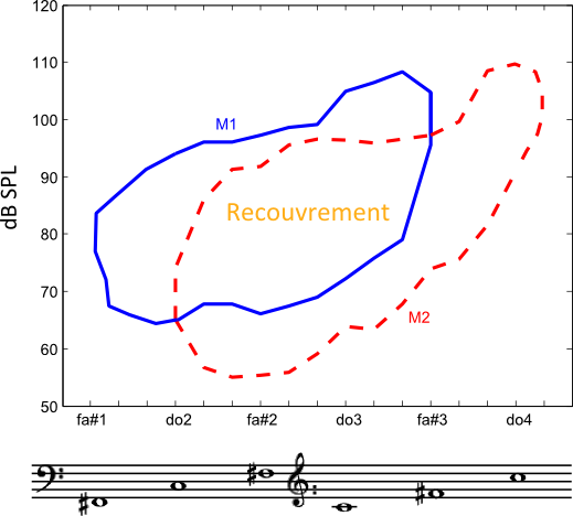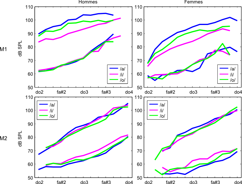 L'un des résultats les plus importants montre que les sons les plus forts que les chanteurs peuvent produire sont 10 dB plus intenses pour un /a/ que pour un /i/ en M1, mais aussi intense pour /a/ et /i/ en M2. L'analyse des signaux sonores montre que le quotient, en moyenne plus faible en M2 qu'en M1, peut expliquer en partie cette différence.